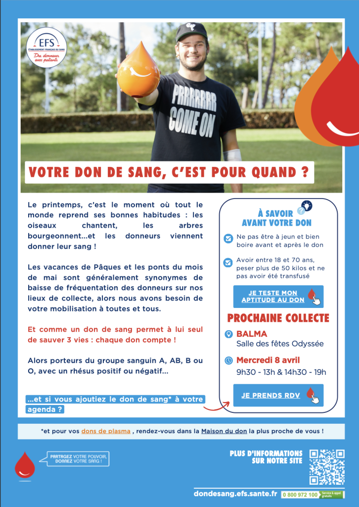 - Prise de rendez-vous : dondesang.efs.sante.fr ou application mobile « Don de sang »